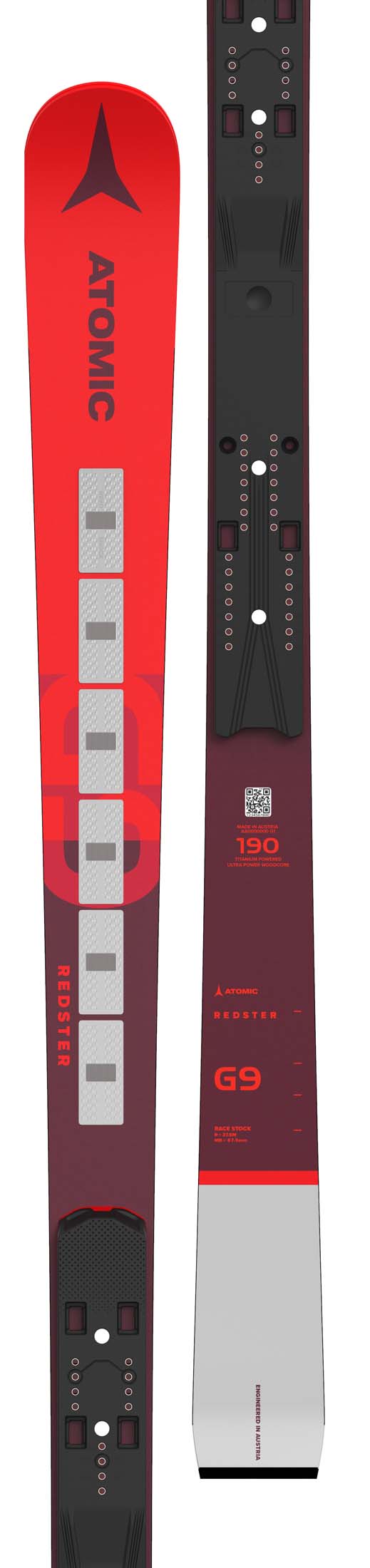 The Atomic Redster G9 RS Revoshock I 190 was made to get Masters GS racers through the gates as fast as possible. Chasing hundredths of a second on race day is as much about control and efficiency as pure speed. That’s what Atomic’s Revoshock technology is all about. Made up of a series of spring steel plates encased in an integrated elastomer compound, Revoshock absorbs bumps, keeping the ski smooth and stable without sacrificing super quick edge-to-edge agility and powerful accelerations out of every turn - the ultimate in handling. Full-length sidewalls create insane edge hold while Ultra TI Powered laminate keeps the ski torsionally rigid, no matter how rutted out the course might be. Atomic’s Ultra Power Woodcore and the integrated Icon binding interface keep you in control from start to finish.